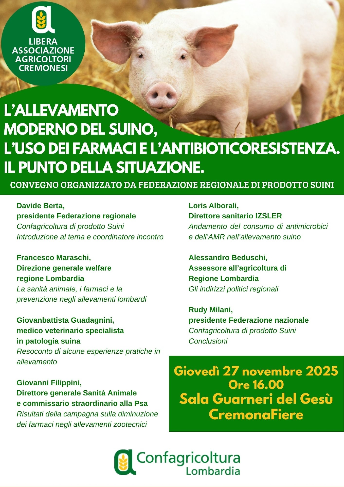 Giovedì 27 novembre 2025, alle ore 16.00, nella Sala Guarneri del Gesù a CremonaFiere si terrà il convegno “L’allevamento moderno del suino, l’uso dei farmaci e l’antibioticoresistenza. Il punto della situazione”, organizzato dalla Federazione Regionale di Prodotto Suini in collaborazione con Confagricoltura.