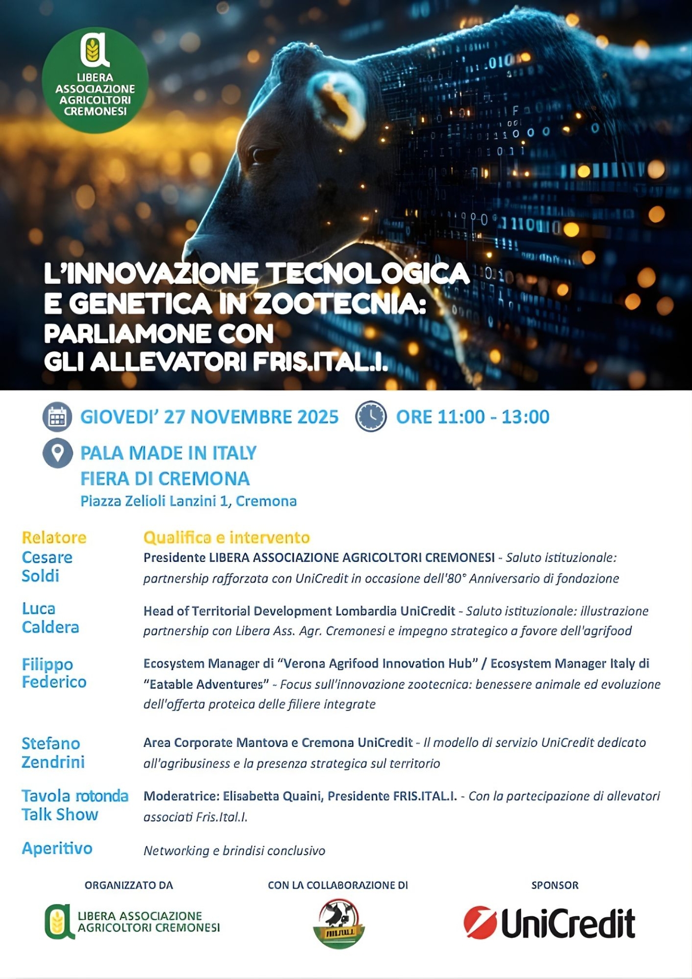 Dalle 11 alle 13, al Pala Made in Italy, si terrà la tavola rotonda «L’innovazione tecnologica e genetica in zootecnia – parliamone con gli allevatori FRIS.ITAL.I.», un appuntamento voluto da Libera per mettere al centro le esigenze degli allevatori cremonesi e lombardi, con il contributo di FRIS.ITAL.I. e UniCredit.
