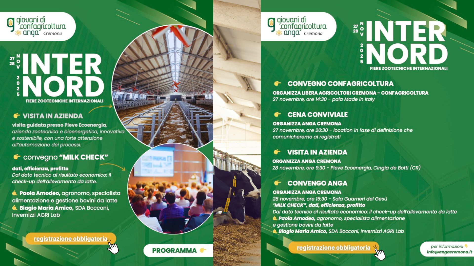 Nel pomeriggio, il programma rientra in Fiera per il convegno tecnico ANGA “MILK CHECK – Dati, efficienza, profitto”, alle ore 15.30 presso la Sala Guarneri del Gesù. Il focus sarà sul ruolo del dato nella gestione dell’allevamento da latte: conoscere con precisione i numeri aziendali è la condizione indispensabile per prendere decisioni consapevoli e migliorare la redditività.