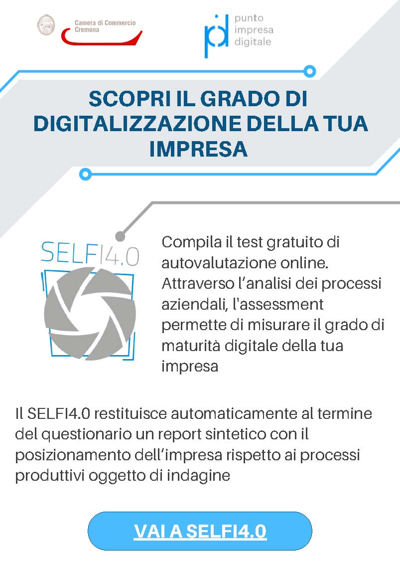 Prima di avviare un percorso in chiave 4.0 è importante conoscere il livello di digitalizzazione di partenza della propria impresa. A tale scopo i PID (Punto Impresa Digitale) hanno progettato uno strumento di assessment digitale per capire il livello di digitalizzazione interno all’impresa: il SELFI4.0 è un assessment on line che l’impresa può compilare in completa autonomia, che restituisce automaticamente un report sintetico sul posizionamento dell’impresa rispetto ai processi produttivi oggetto di indagine.
