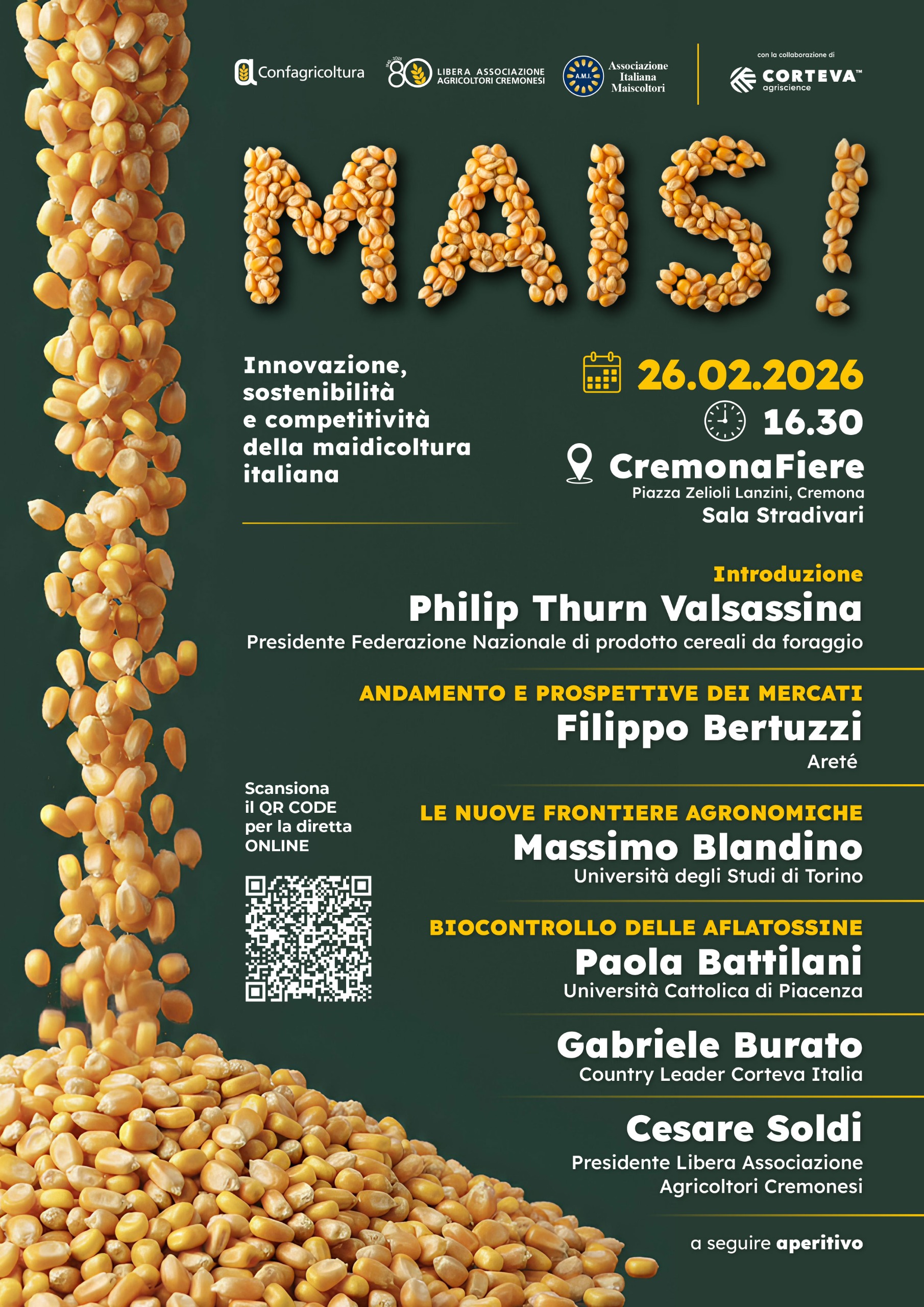 Giovedì 26 febbraio 2026, alle 16.30, a CremonaFiere (Piazza Zelioli Lanzini, Cremona) nella Sala Stradivari, si terrà l’appuntamento dedicato a innovazione, sostenibilità e competitività della maidicoltura italiana.